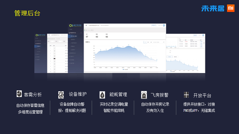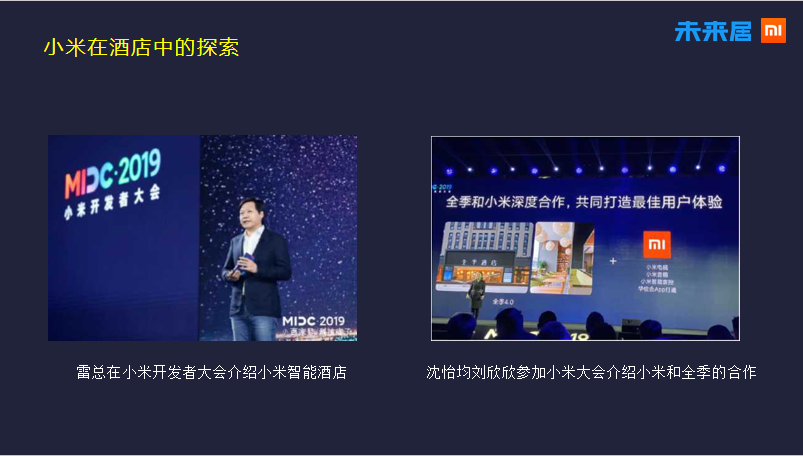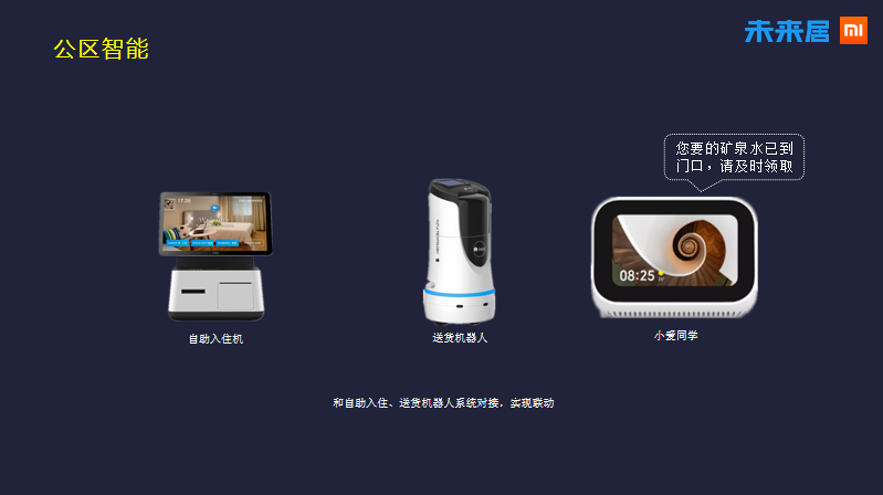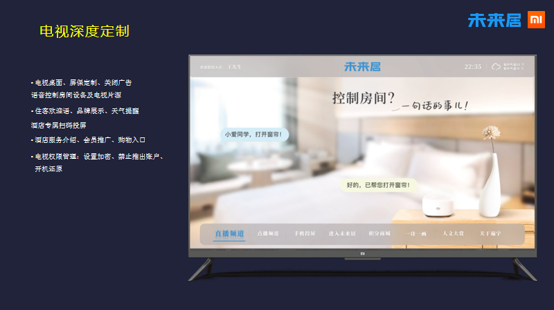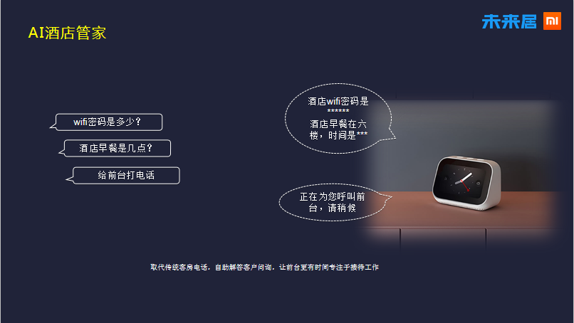 未來居針對酒店行業所研發的全終端系統,提供從新建全功能智能酒店、到改造輕量級智能方案,為酒店行業提供定制化智能解決方案,將小米強大的AIoT資源聯動起來,從產品多樣化選擇如語音管家、機器人智能聯動,再到智能底層技術加服務系統平臺,全方位的支持酒店行業向智能化邁進,幫助酒店行業跨越傳統,真正落地智能服務。