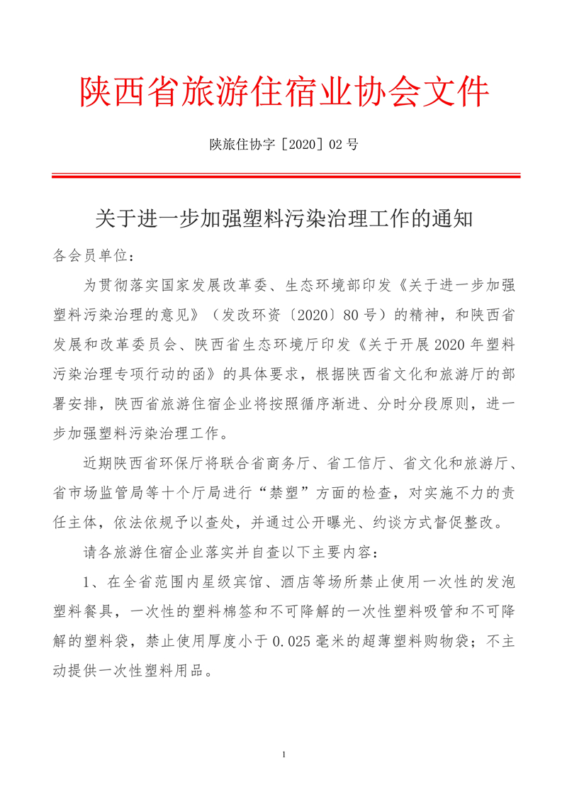 酒店、餐飲行業(yè)作為“禁塑令”緊密相關(guān)行業(yè),陜西省旅游住宿業(yè)協(xié)會(huì)也于2020.12.1發(fā)布《關(guān)于進(jìn)一步加強(qiáng)塑料污染治理工作的通知》如下。